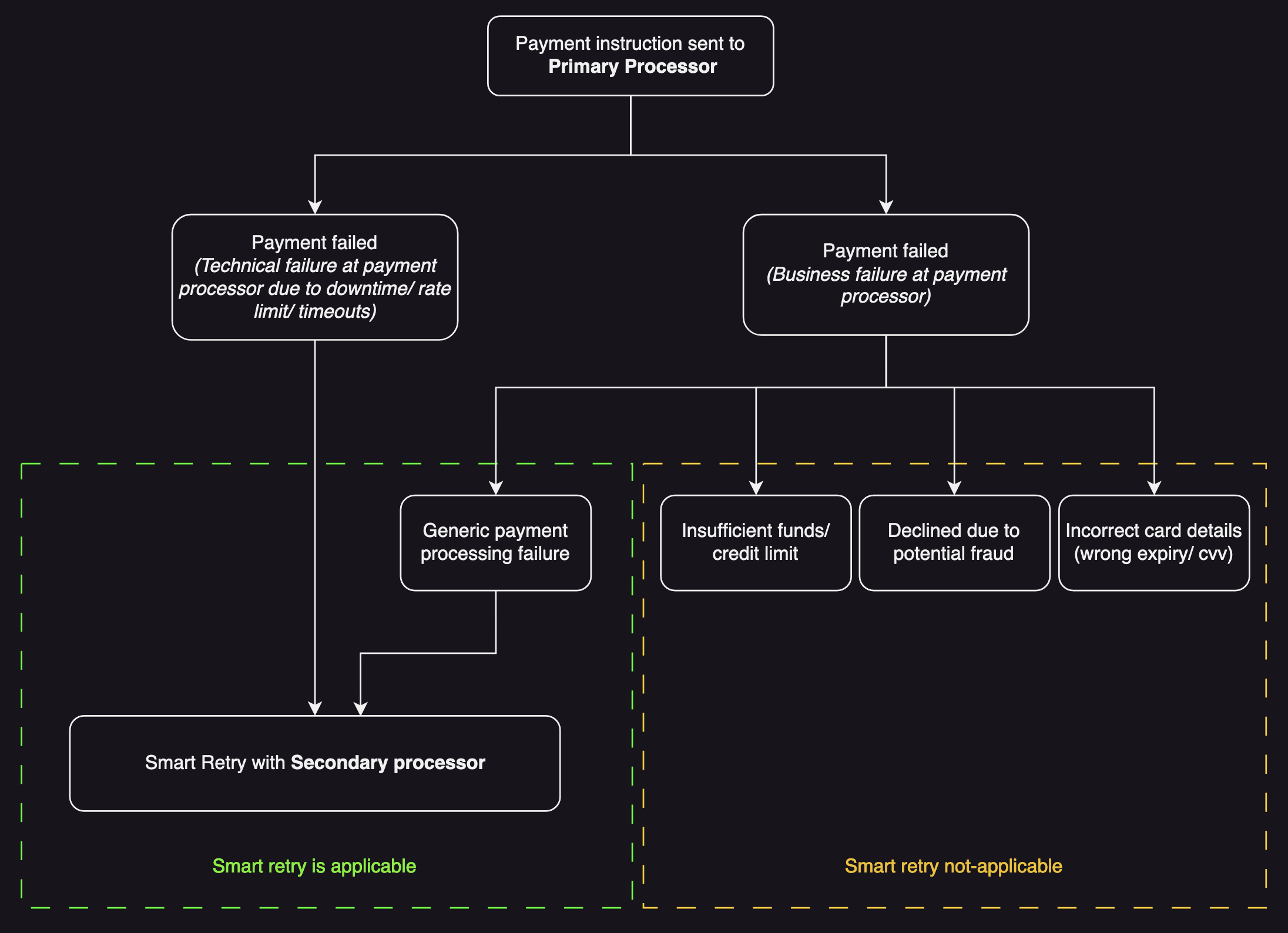Smart retry will be attempted whenever the payment fails through the Primary Processor for card transactions.