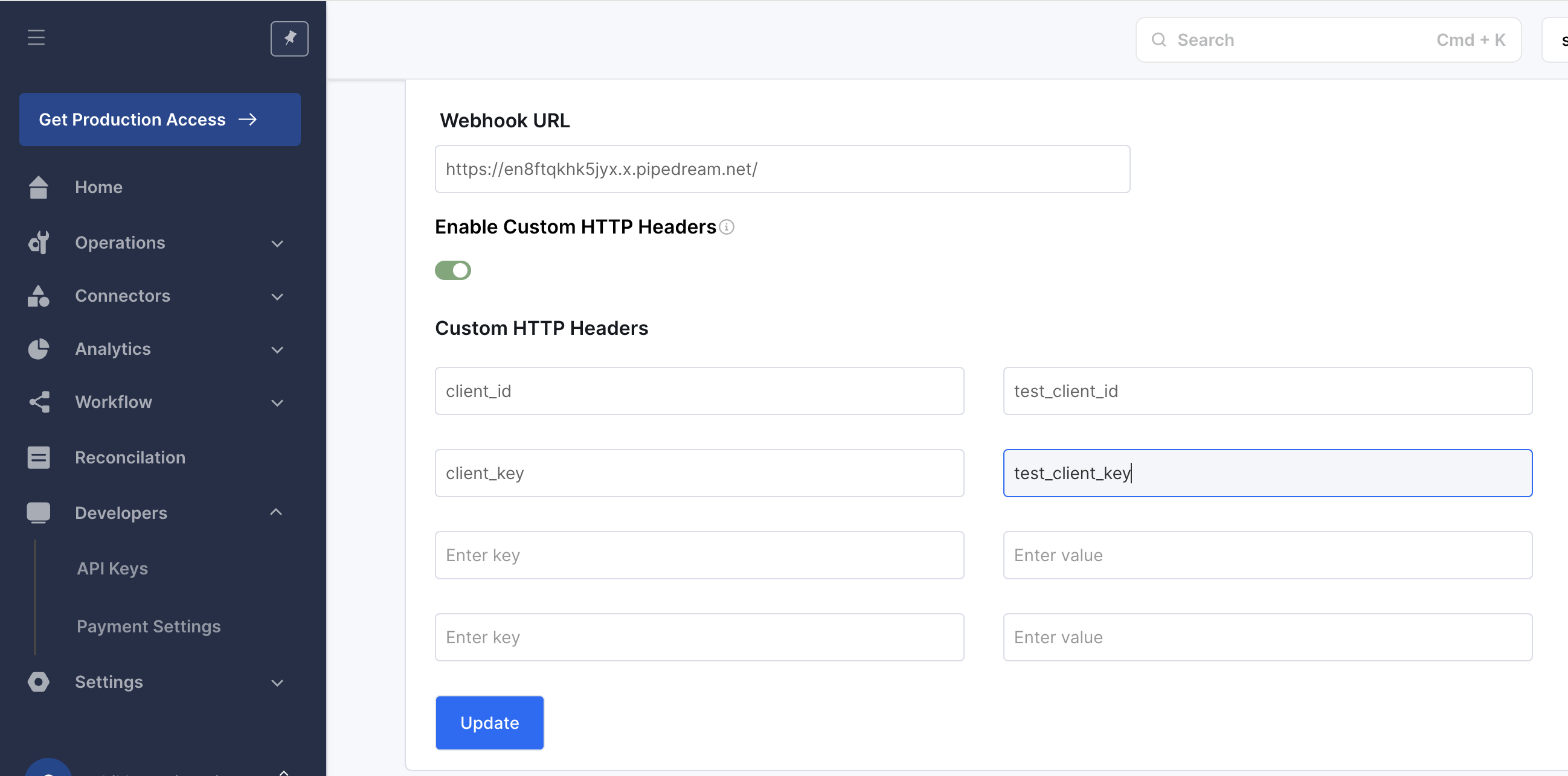 In case a merchant wants to set custom headers for sending data to a specified webhook endpoint, these custom headers allow the receiving application to verify the webhook requests and reject any that do not include them. Update your webhook custom HTTP headers as shown below (you must provide a webhook URL to set custom HTTP headers).