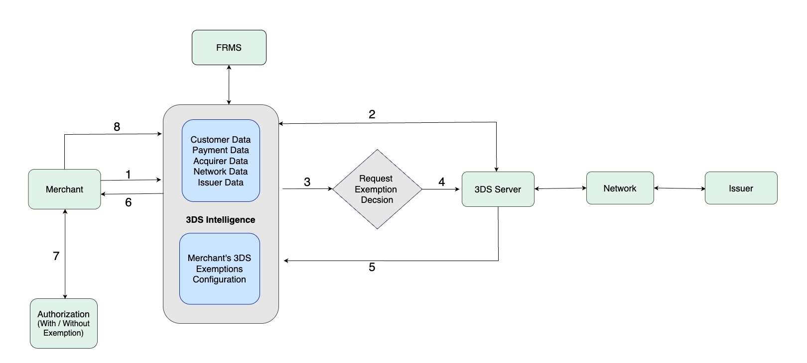 - After 3DS Authentication (with or without exemption), the result is fed back to the 3DS Intelligence Engine.