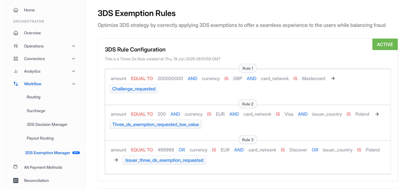 A merchant has to first configure the 3DS Exemptions Rules in the OrchestratorX Dashboard by navigating to Control Center (Dashboard) -> Workflow -> 3DS Exemption Rules. Custom rules can be defined as per the merchant's own business requirements. The rules can be defined across 22 different parameters like Issuer Country, Customer Device Platform, Card Network, Acquirer providing a wide range of flexibility.