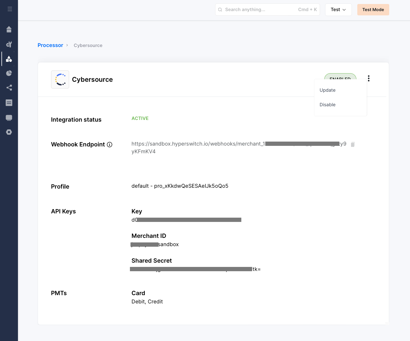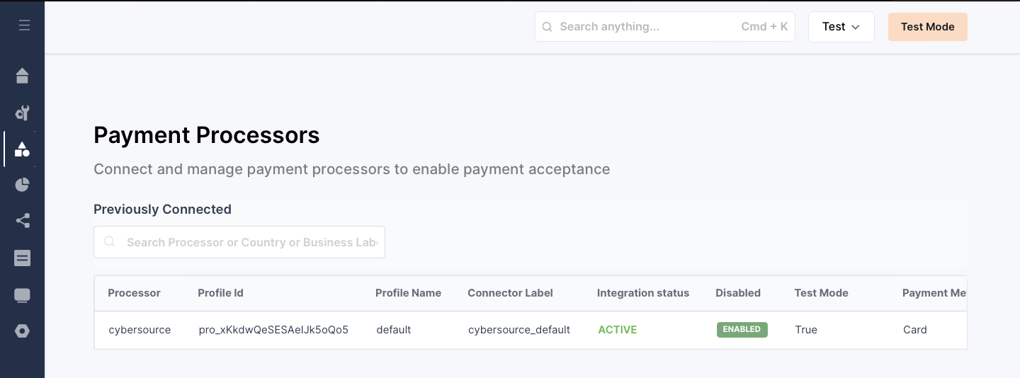 Connectors > Payment Processors. - If you have already configured CyberSource successfully, you will land on the page shown in the image below.