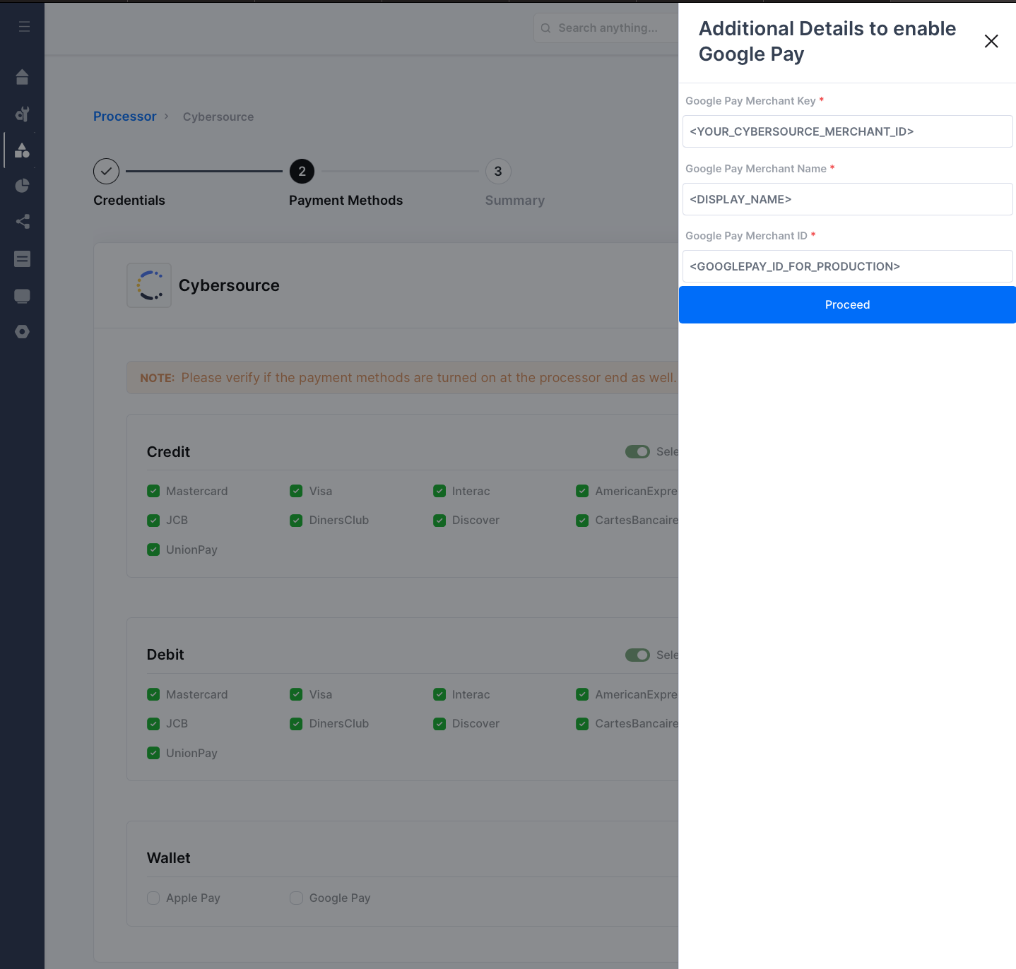 - Enter the Google Pay details in the overlay form and click Proceed: