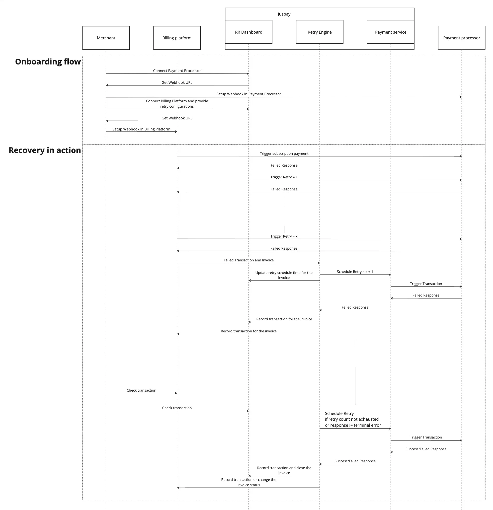 Once the setup is complete, Revenue Recovery automatically begins monitoring transactions via webhook. When a failed transaction is detected, the system evaluates over 20 parameters to intelligently schedule a retry, aiming to recover the payment. These transactions are then recorded back into the subscription platform to avoid subscription cancellations.